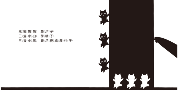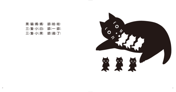在畫面上,黑與白的對比加上單純的造型,讓黑貓媽媽、三隻小白貓及小黑貓都讓人留下深刻印象。畫面上黑白的對比同時也營造出剪紙畫般陰陽相襯的效果。有趣的是,當你仔細觀察畫面,就會發現小白貓都是從黑貓媽媽身上剪開,被白底襯出來的,而剪下來的小黑紙片就變成了小黑貓。