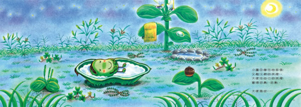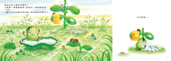 故事的第一頁就描繪出小蠶豆每天沐浴在大自然各種令人欣喜的生活素材裡的幸福:除了他彷彿襯了柔軟蓬鬆床墊的豆莢床以外,他還用露水洗臉、用乾草毛巾擦臉,然後用橡實杯子啜飲新鮮的朝露,開始他一天的遊歷!
